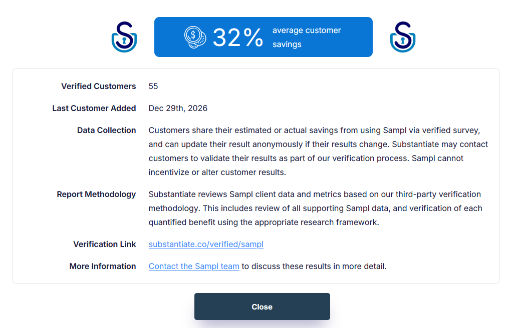 Does your business use statistics to demonstrate the value of your solution? Enhance your marketing claims with user-provided data and let your customers speak for you. Substantiate provides a drop-in survey platform, third-party verification and independent digital report. Built with trust in mind, we turn generic marketing claims into clear customer proof.