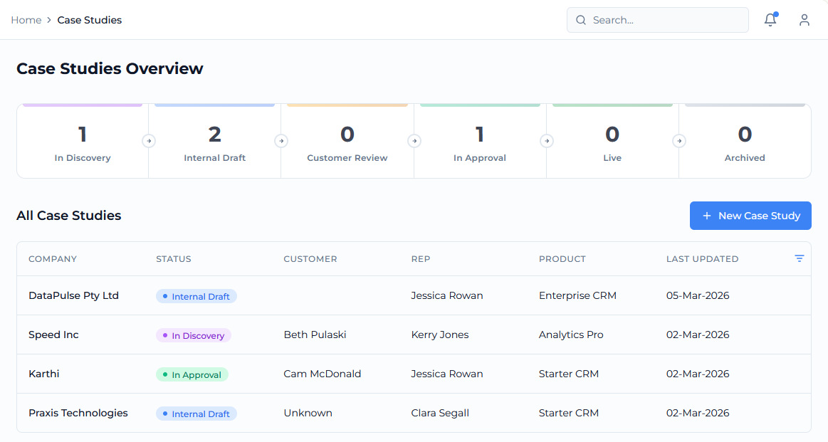 Our case study workflow generates to assets for each stage of your case study, including getting signoff from communications and legal teams.